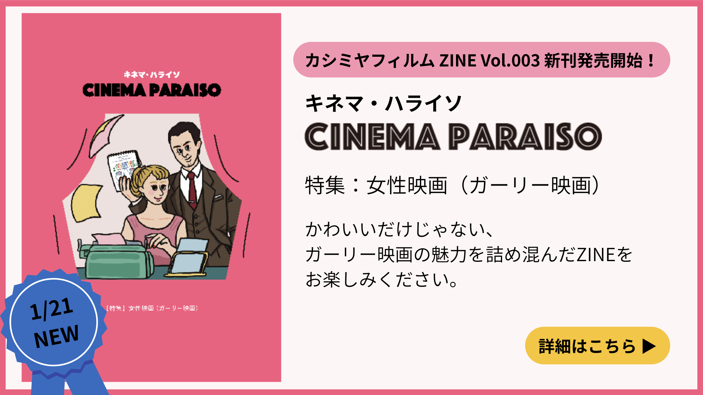 不定期にZINEを発行しています!ミニシアター系映画の紹介や、インタビュー記事など読み応えのあるコラムと、素敵なイラスト、読みやすいデザイン!映画愛がつまったZINEです。オンラインショップで販売中です!