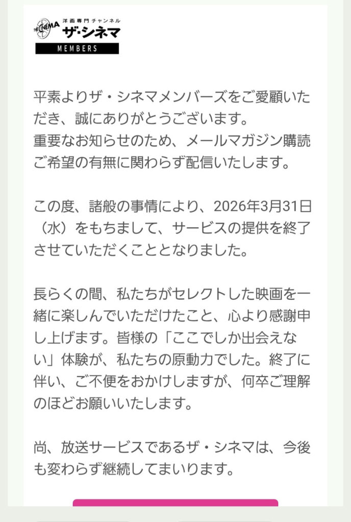 ザ・シネマメンバーズさんのサービスが終了となるという内容です。